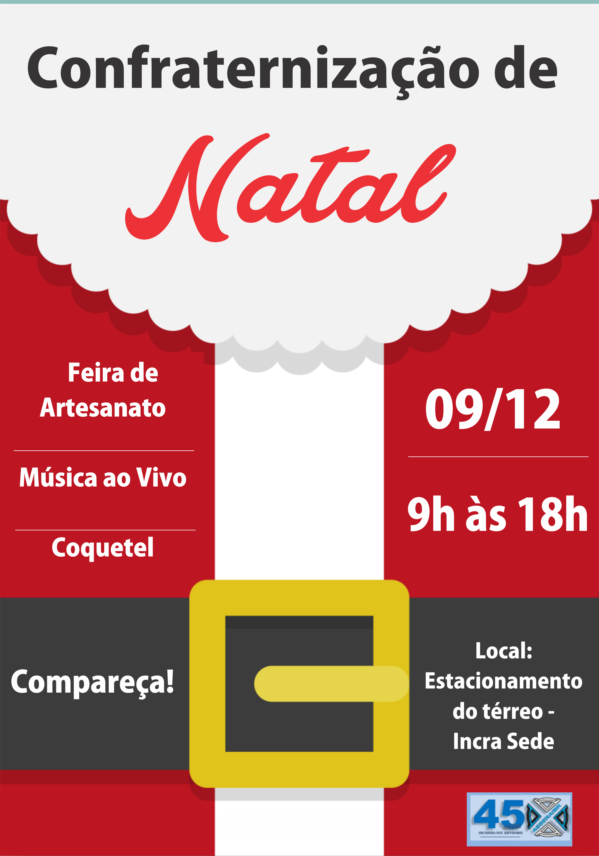 A tradicional comemoração de fim de ano da ASSERA/BR será realizada no dia 9 de dezembro, no térreo Edifício Palácio do Desenvolvimento, a partir das 9:00 h. Serão oferecidos aos convidados feira artesanal, apresentação de música, voz e violão e, para fechar as comemorações, um coquetel a partir das 17:00 h.