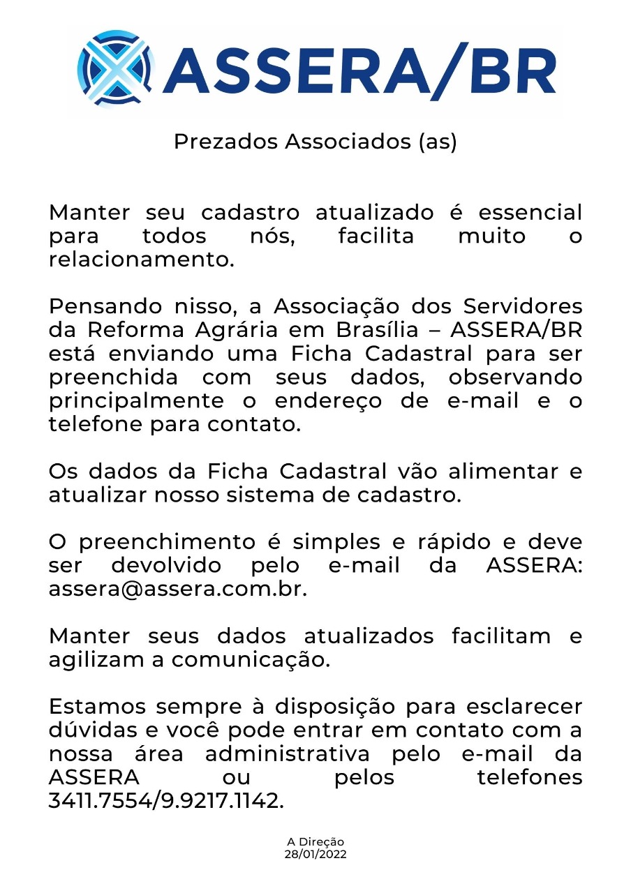 28 Janeiro 2022 Manter seu cadastro atualizado é essencial para todos nós, facilita muito o relacionamento clique aqui: Formulário de cadastro