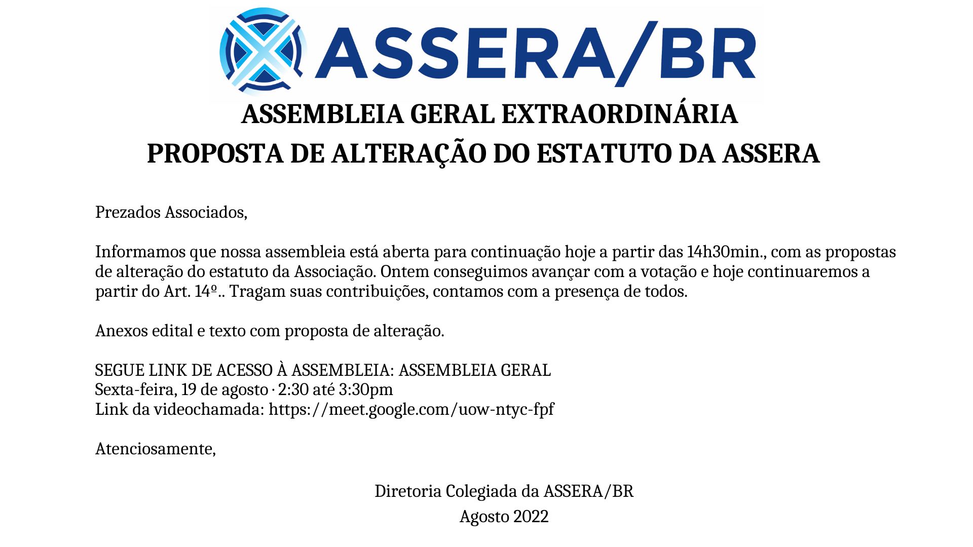 19 Agosto 2022 Assembleia Geral Extraordinária Proposta de Alteração do Estatuto da Assera » Para participar da reunião no Google Meet clique aqui: