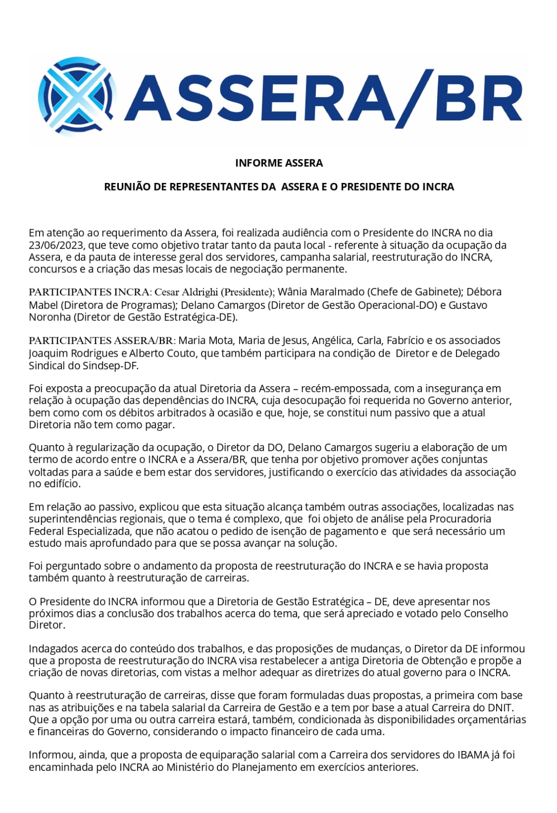 INFORME ASSERA - REUNIÃO DE REPRESENTANTES DA ASSERA E O PRESIDENTE DO INCRA