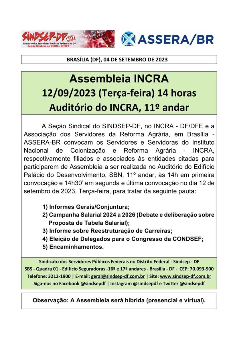 Edital de Convocação para Assembleia Conjunta SINDSEP-DF e ASSERA/BR