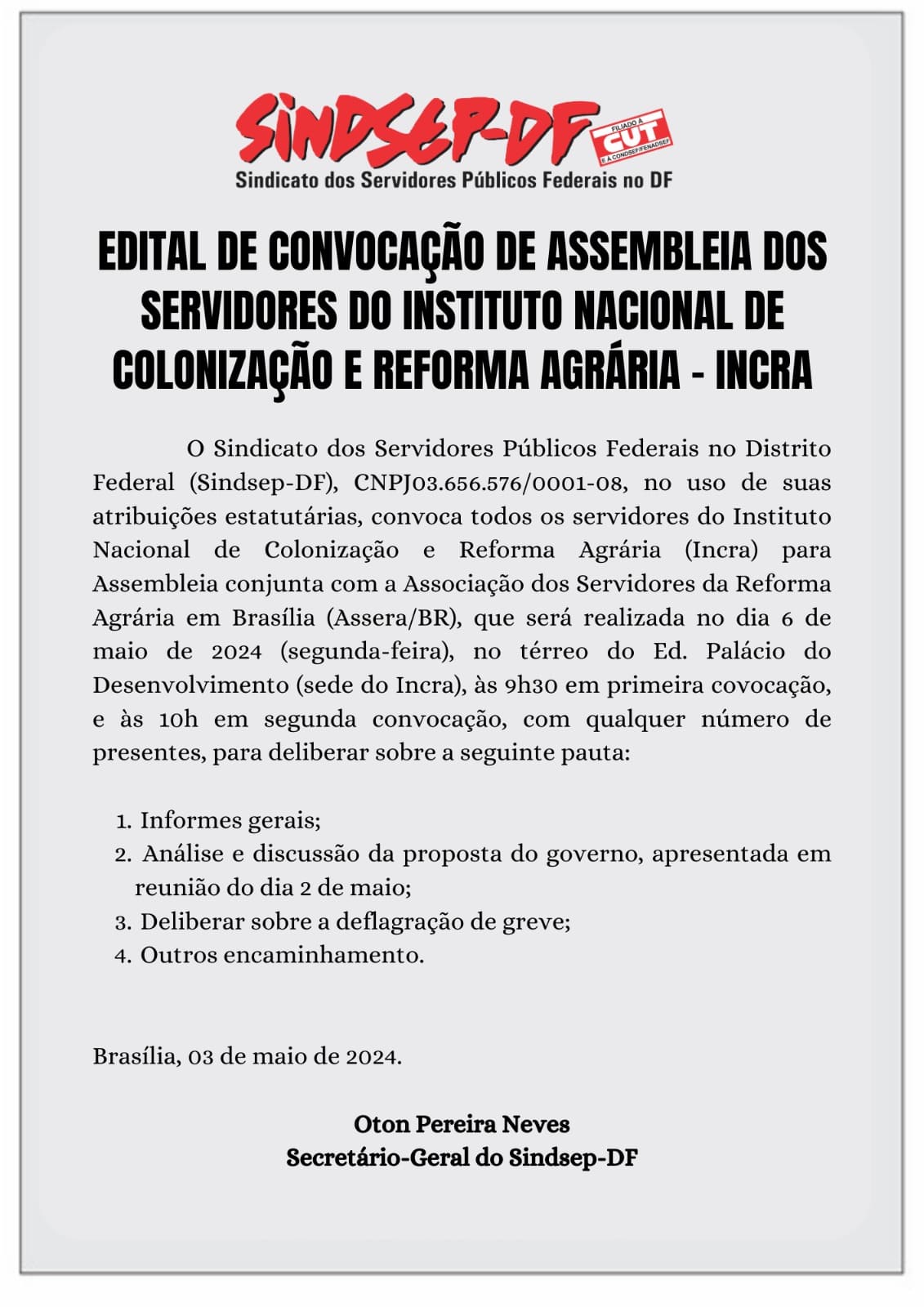 03 Maio 2024 Edital de Convocação de Assembleia dos Servidores do Instituto Nacional de Colonização e Reforma Agrária - INCRA Disponível também em PDF CLICANDO AQUI ou na IMAGEM: